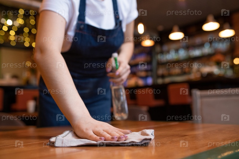 Рука молодой современной официантки, стирающей деревянный стол пылесосом