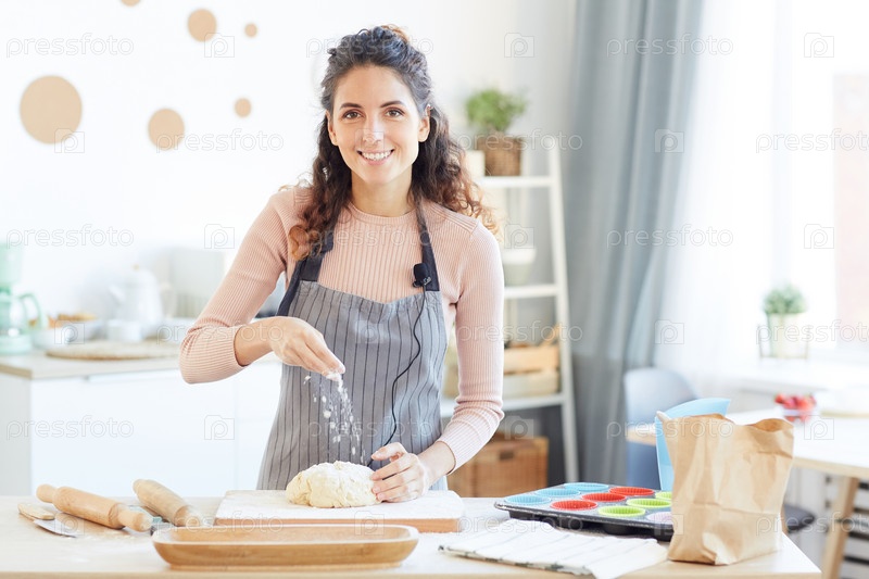 Женщина, добавляющая муку в тесто