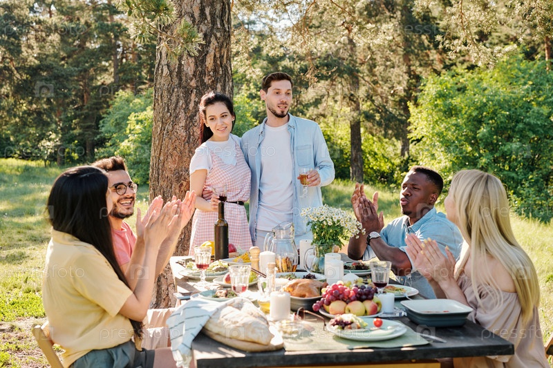 Молодые межкультурные свидания хлопают в ладоши, поздравляя своих друзей