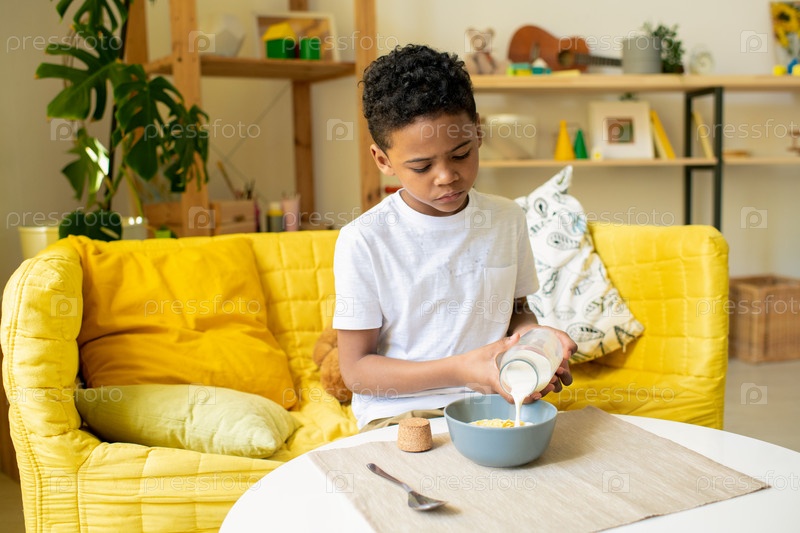 Радостный маленький африканский мальчик в белой футболке кладет кусочек пищи в рот