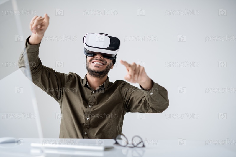 Молодой жизнерадостный бизнесмен в VR headset making presentation by workplace