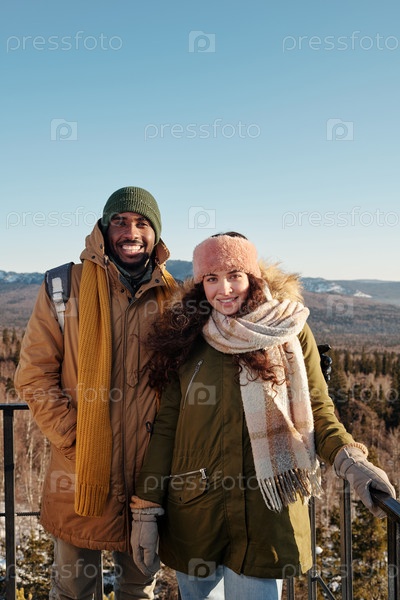 Молодые межкультурные свидания в зимней одежде, стоящие против голубого неба и горы