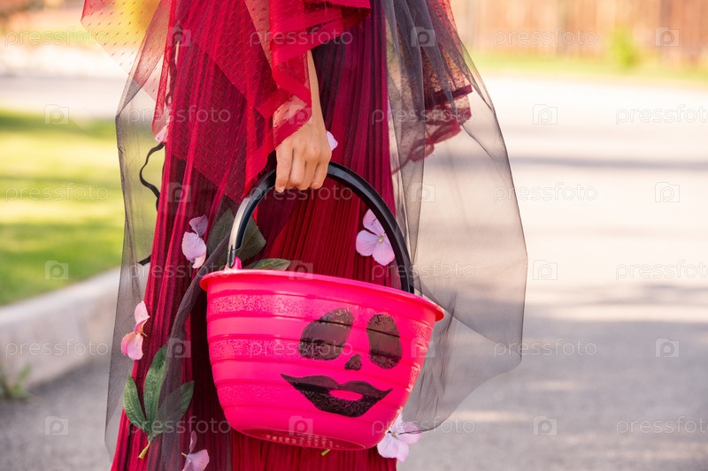 Рука маленькой девочки в костюме ведьмы Хэллоуина, держащей розовую пластиковую корзину