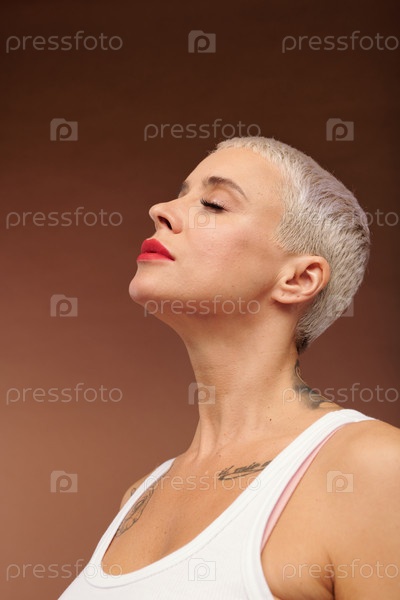 Спокойная женщина с короткими светлыми волосами, закрытыми глазами, татуировками на шее и груди