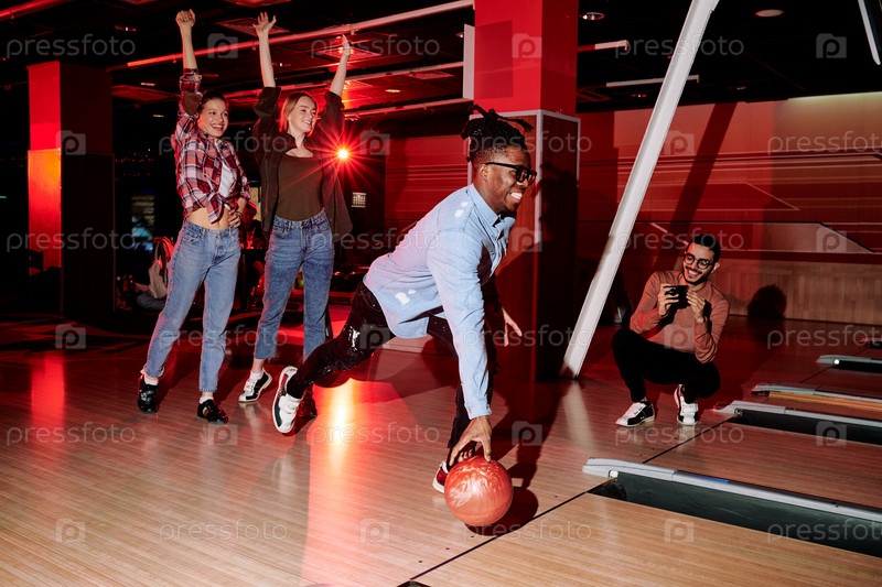 Веселый активный парень африканской этнической принадлежности собирается бросить мяч в боулинг на переулок