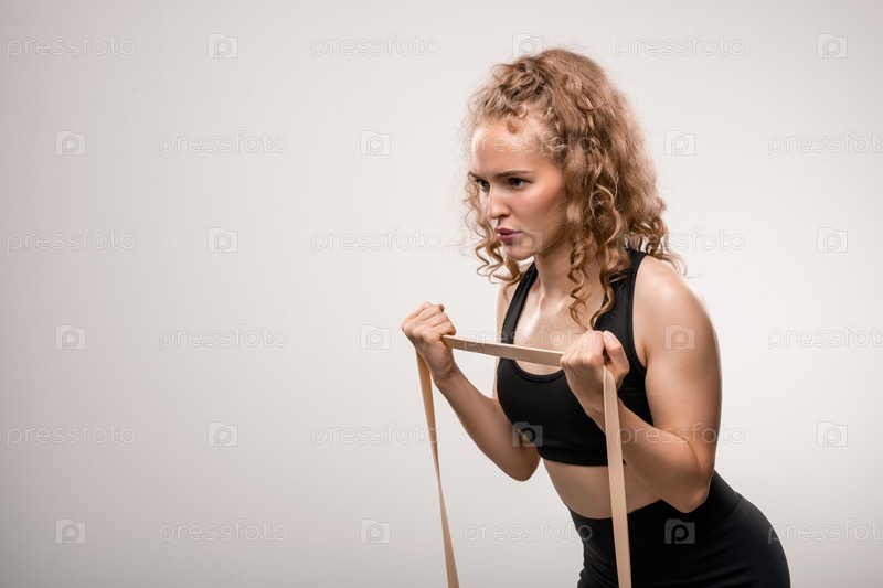 Молодая спортсменка с светлыми кудрявыми волосами, прилагающая усилия во время тренировки