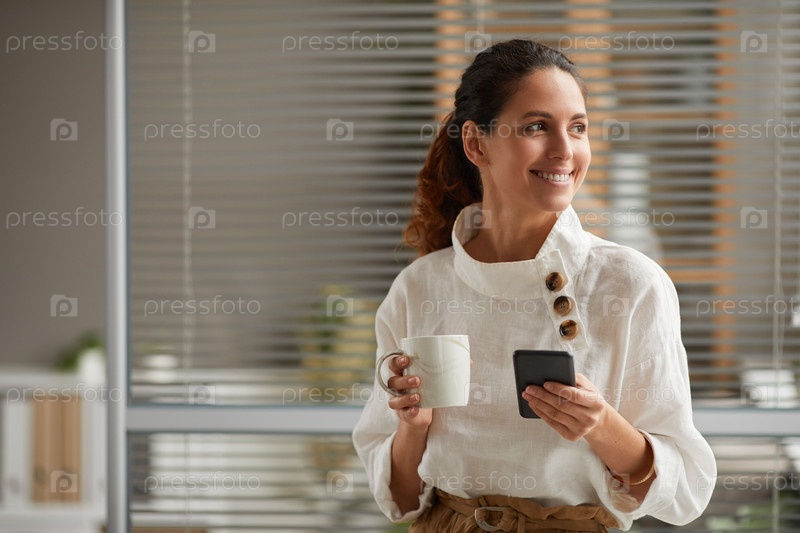 Успешная молодая женщина наслаждается кофе на работе