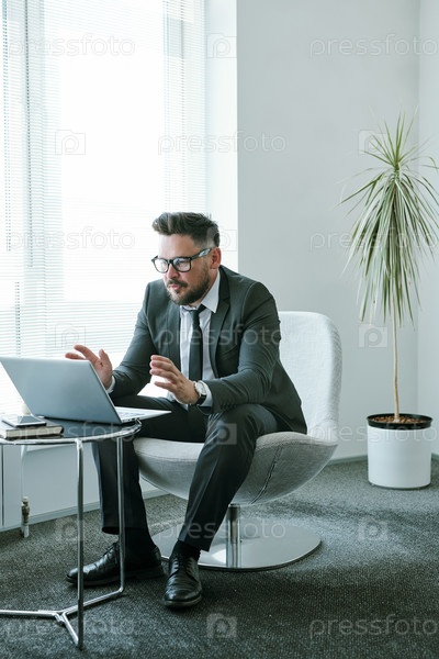 Уверенный бизнесмен общается с деловыми партнерами через видеочат
