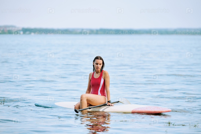 Расслабленная женщина в купальнике, сидящая на доске для серфинга с веслом и плавающая по воде