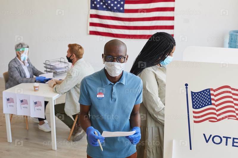 Люди, носящие индивидуальные защитные принадлежности на избирательных участках