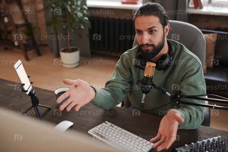 Горизонтальный средний портрет современного молодого ближневосточного человека с бородой на лице, сидящего за столом и разговаривающего со своими подписчиками во время онлайн-трансляции