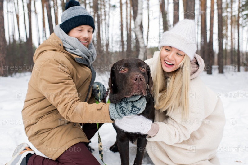 Счастливая молодая любящая пара играет с черным ретривером, сидящим на снегу