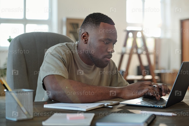 Молодой африканский фрилансер или менеджер домашнего офиса, печатающий перед ноутбуком