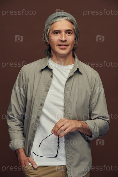 Портрет улыбающегося красивого зрелого мужчины, держащего очки во время позирования в фотостудии на темном фоне