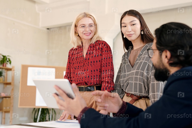 Две счастливые женщины в умной повседневной одежде смотрят на своего коллегу-мужчину