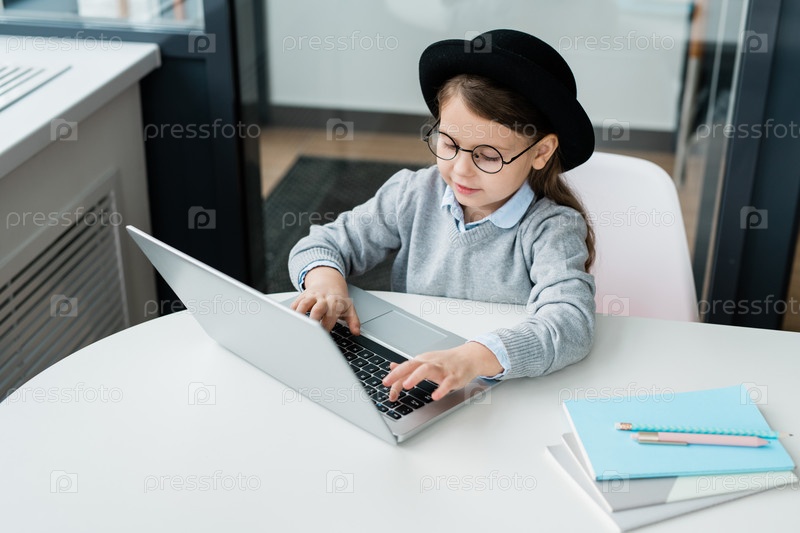 Умная школьница в очках, готовя домашнее задание и используя ноутбук