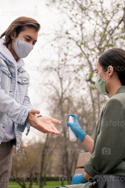 Молодой человек в маске открывает ладони, пока его девушка распыляет дезинфицирующее средство