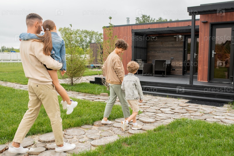 Задний вид счастливой молодой современной семьи родителей и двух маленьких детей
