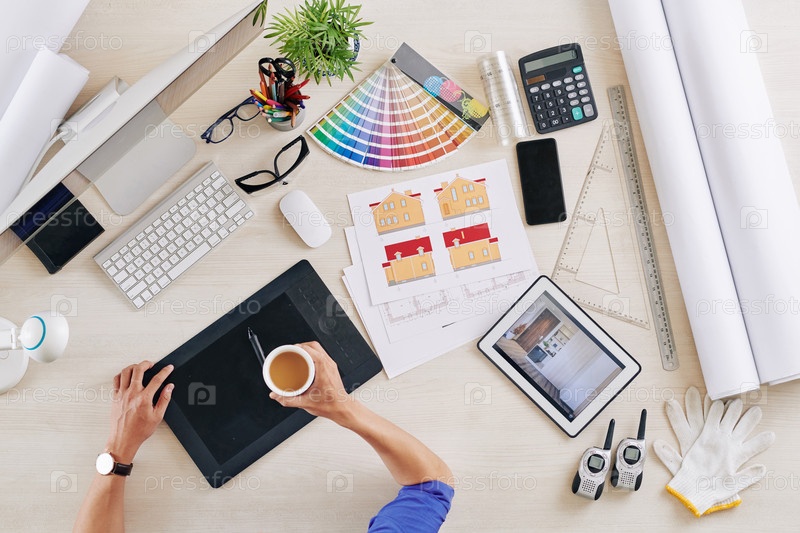 Дизайнер интерьеров пьет кофе