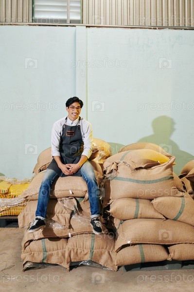 Владелец пекарни сидит на мешках