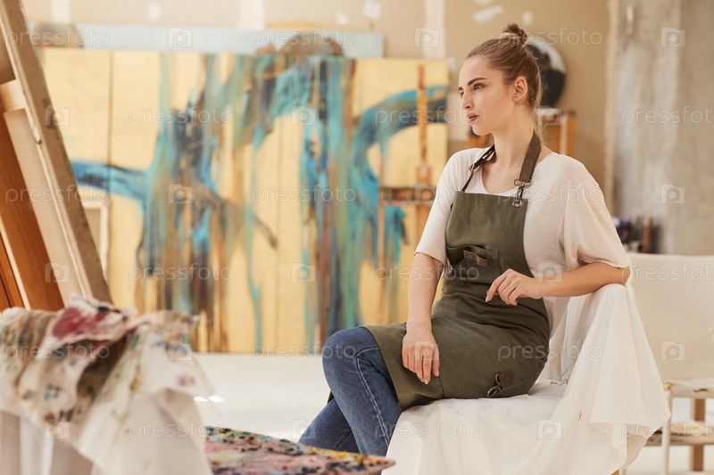 Пенсивная женщина-художник смотрит на живопись