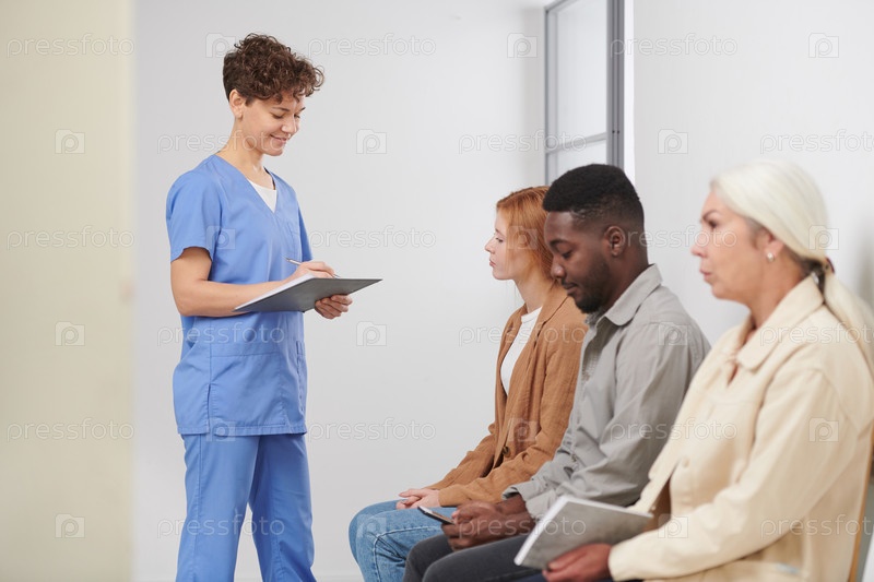 Группа из трех мультиэтнических людей, сидящих в очереди и ожидающих консультации в современной больнице, медицинский работник стоит рядом с проверкой посещаемости