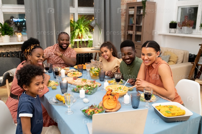 Счастливая африканская семья разговаривает со своими друзьями в видеочате у праздничного стола