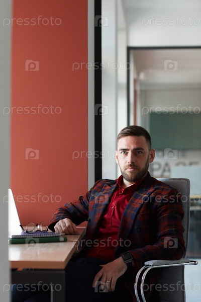 Портрет успешного элегантного бизнесмена в красном офисе