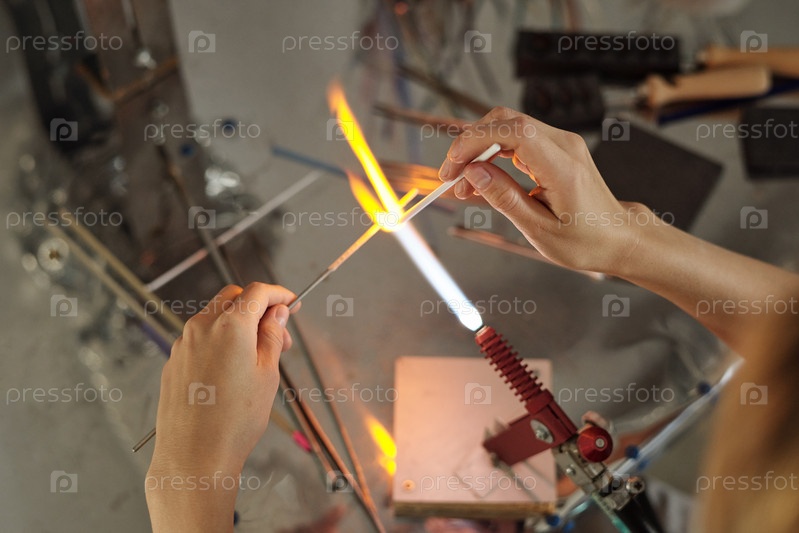 Руки молодой ремесленницы обрабатывают две палочкообразные заготовки в мастерской
