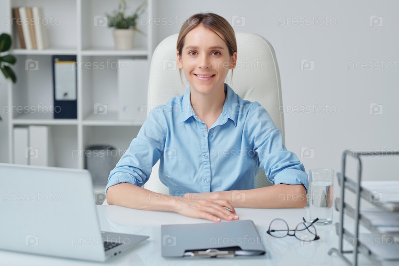 Молодая привлекательная бизнесвумен с светлыми волосами и зубчатой улыбкой смотрит на тебя