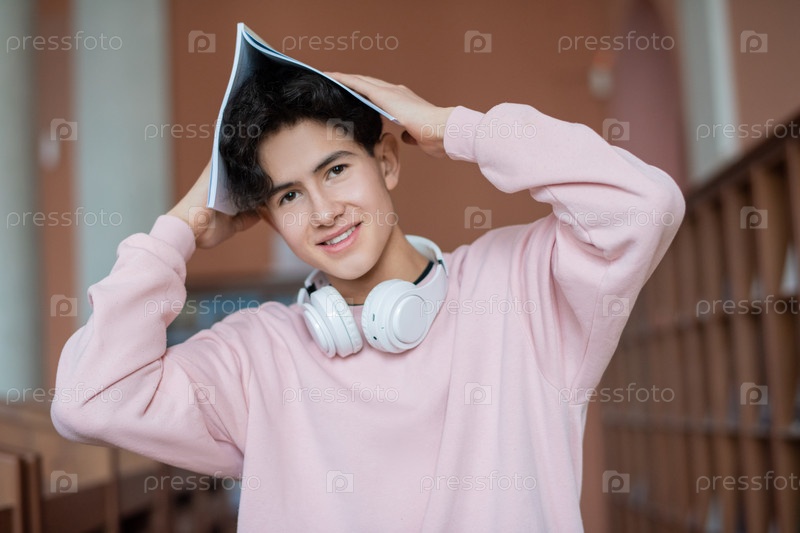 Счастливый подросток держит копирайтер над головой, стоя перед камерой