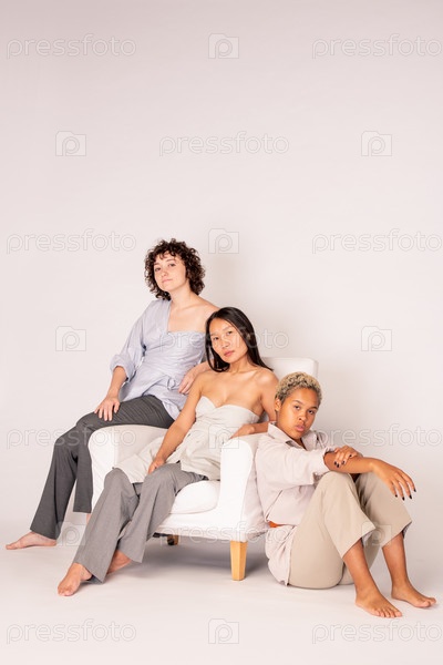 Молодая азиатская женщина сидит в кресле, окруженная африканскими девушками