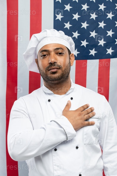 Успешный шеф-повар ресторана с рукой на груди стоит перед камерой