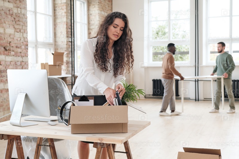 Круглая молодая женщина в белой блузке стоит за деревянным столом с компьютером и распаковывает личные вещи из коробки в новом офисе