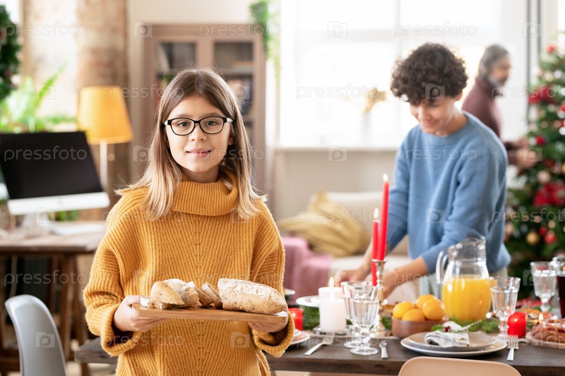 Счастливая девушка в очках и желтом свитере, держащая доску со нарезанным хлебом