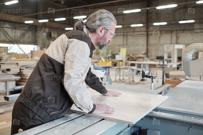 Пожилой мужчина в рабочей одежде наклоняется над деревянной доской, когда собирается ее срезать