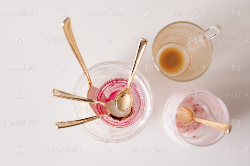 Группа пустых немытых стаканов и чайных ложек на кухонном столе после завтрака