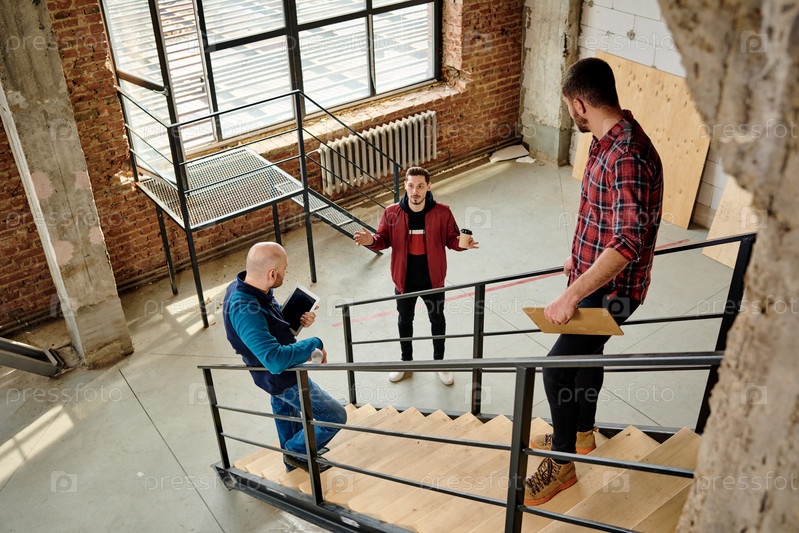 Два инженера в обычной одежде стоят на лестнице внутри незавершенного здания