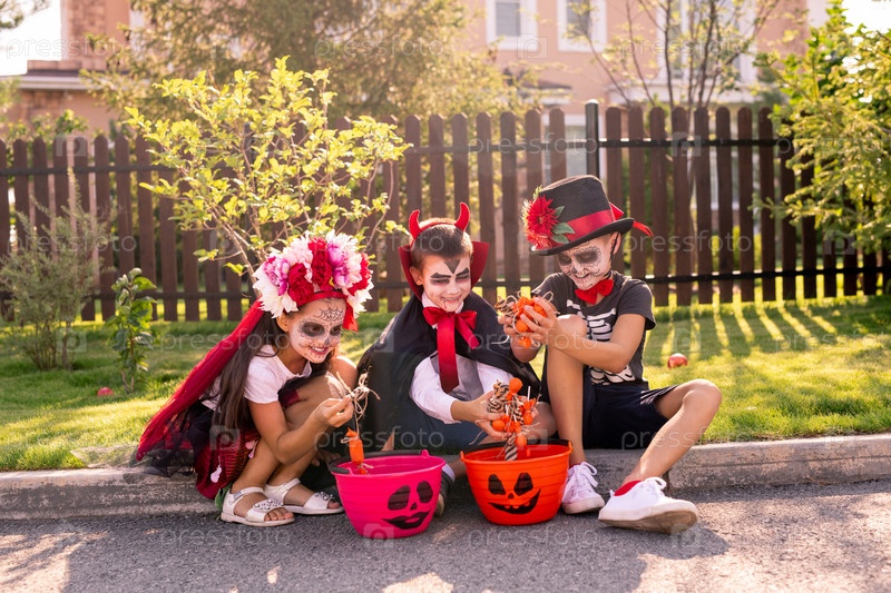 Милая маленькая девочка и два мальчика с покрашенными лицами смотрят на Хэллоуинские угощения