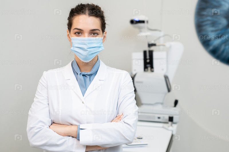 Молодая брюнетка-офтальмолог в защитной маске и белом халате