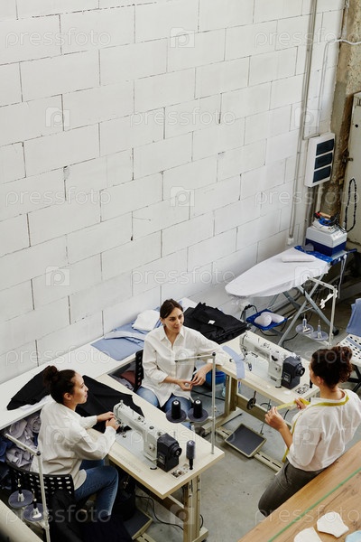 Молодая самоуверенная швейщица консультируется со своими коллегами о некоторых деталях