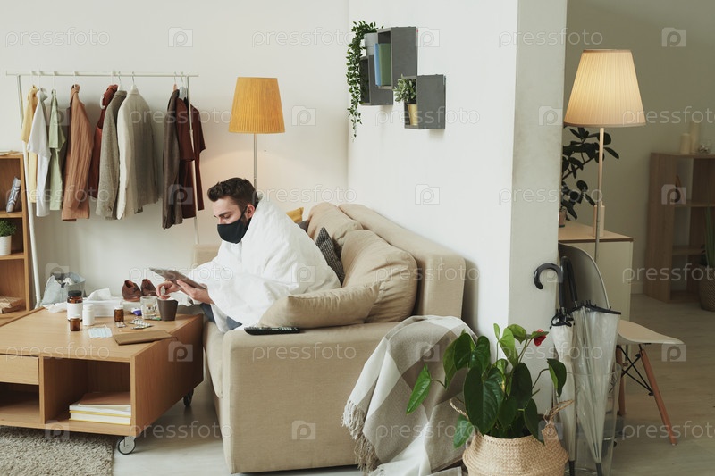 Больной молодой человек в черной маске использует сенсорный панель при работе удаленно