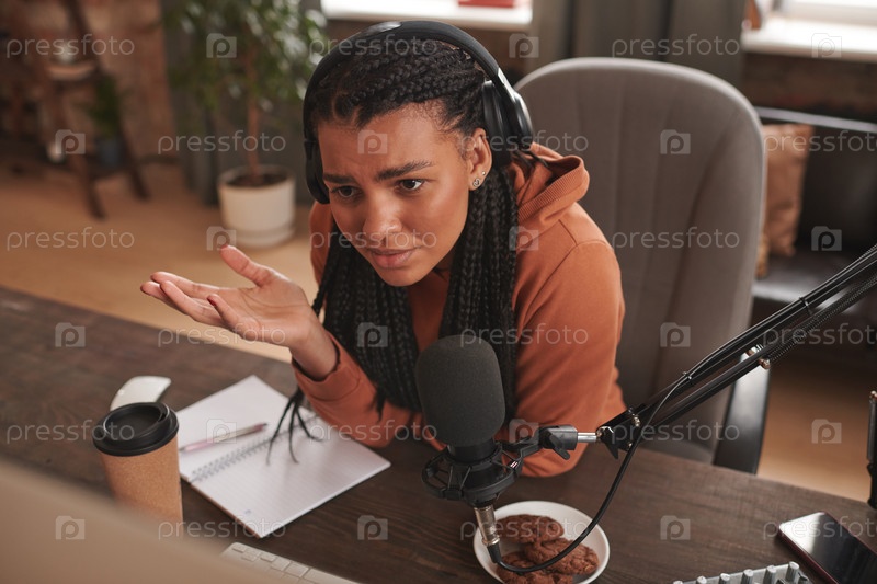Высокоугольный портрет молодой женщины-влиятельницы с наушниками, сидящей за столом и чувствующей себя смущенной, читая странные комментарии к ее контенту
