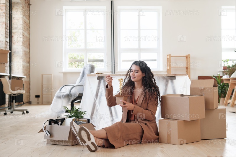 Беспечная молодая женщина-работница в стильном костюме сидит среди коробки на полу и ест лапшу в новом офисе