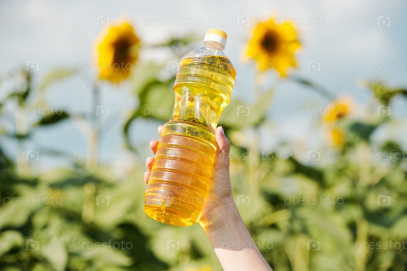 Рука молодой современной фермерки, держащей бутылку со свежим подсолнечным маслом