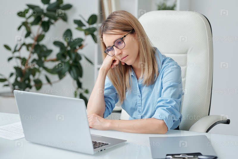 Молодая усталая бизнесвумен с светлыми волосами, несчастливо смотрящая на дисплей ноутбука