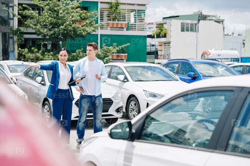 Прогулка с клиентом среди рядов автомобилей