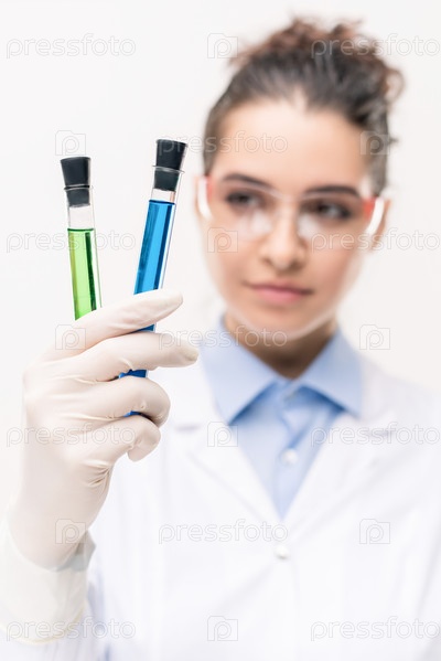 Рука женщины-клинициста или ученого, держащей две колбы с жидкой вакциной