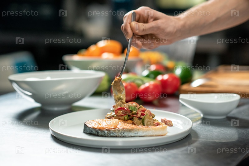 Рука молодого мужского повара, который кладет жареные овощи на кусок жареного лосося
