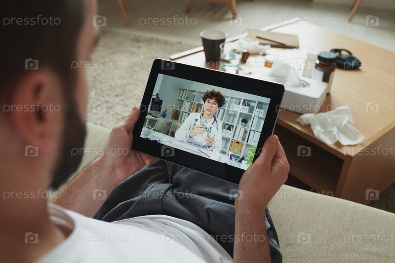 Больной молодой человек сидит на диване во время онлайн-консультации с врачом